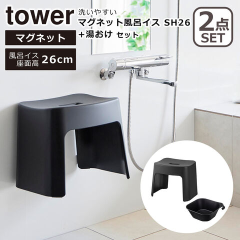 山崎実業 公式 オンラインショップ tower タワー マグネット&引っ掛け湯おけ + 洗いやすいマグネット風呂イス 26cm/SH26 セット お風呂 バスグッズ yamazaki【北海道・沖縄は990円加算】yam9025-bk
