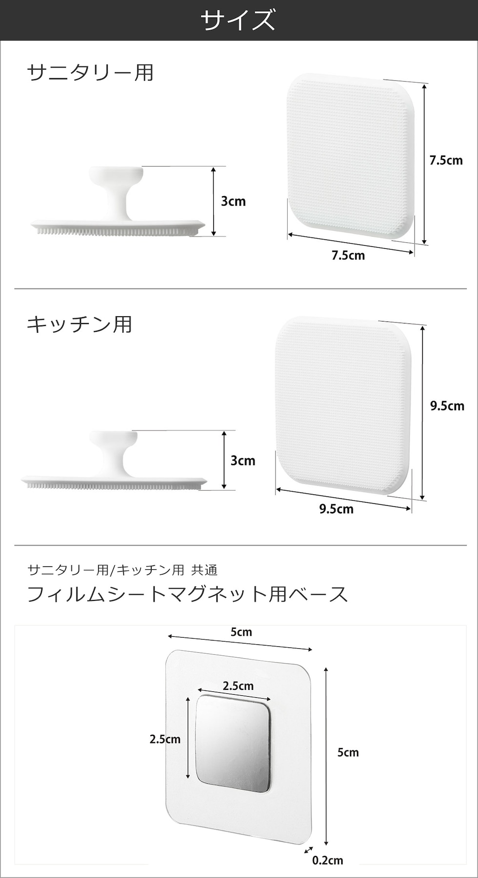 サニタリースポンジ:W7.5 × D7.5 × H3cm マグネット用ベース:W2.5 × H2.5cm(フィルムシート含む:W5 × D0.2 × H5cm) |