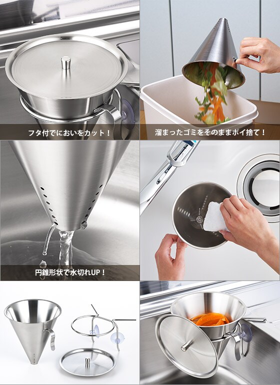 | シンクの三角コーナーがとってもオシャレになりました♪ふた付きで嫌なニオイもカット!円錐形になっているので、水切りも可能に♪付属のホルダーで、シンクのコーナーにスッキリ収納可能♪ | ||||