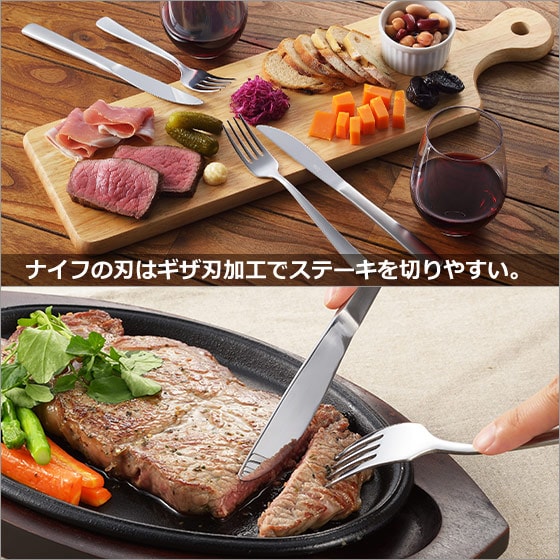 | ステンレス製のシンプルなナイフ&フォークセット。ナイフの刃はギザ刃加工でステーキを切りやすいデザイン。 |