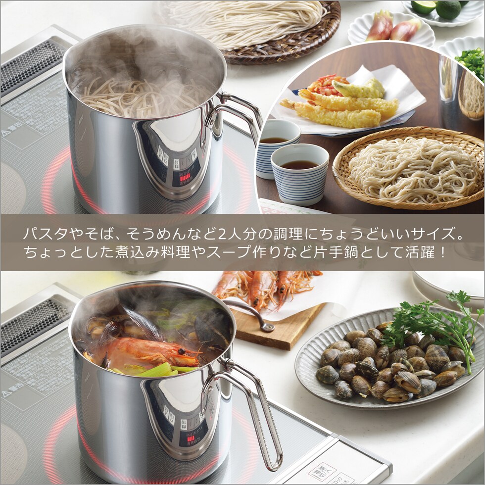 ・IH対応 ・2人分の麺類を茹でるのにちょうど良いサイズ ・煮込み料理やスープ料理など、片手鍋として普段使いにも ・約1.8リットルのお湯が沸かせます |