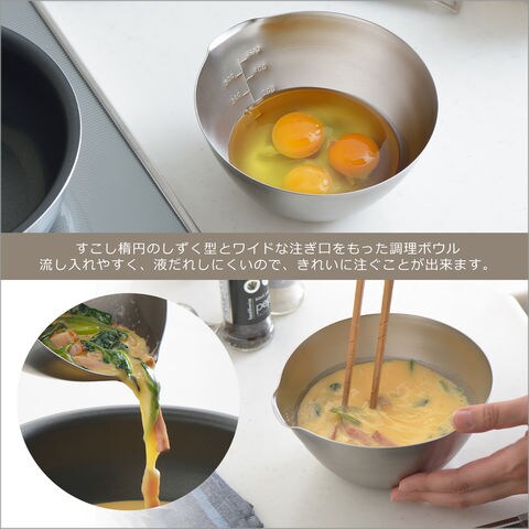 ・すこし楕円のしずく型とすっきり注げるワイドな口の調理ボウル ・流し入れやすく、液だれしにくい形状 ・卵液を溶いて玉子焼きに流し入れたり、小麦粉を溶いた生地を鉄板に流し込んだり、きれいに注ぎことができる ・軽量に仕上げてあるので、手軽に使え苦にならない、日常使いの調理ボウルです |