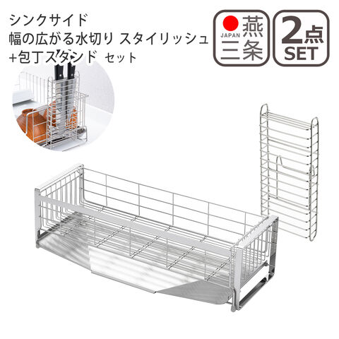【2点セット】 シンクサイド幅の広がるスタイリッシュ水切り + 後付包丁スタンド |
