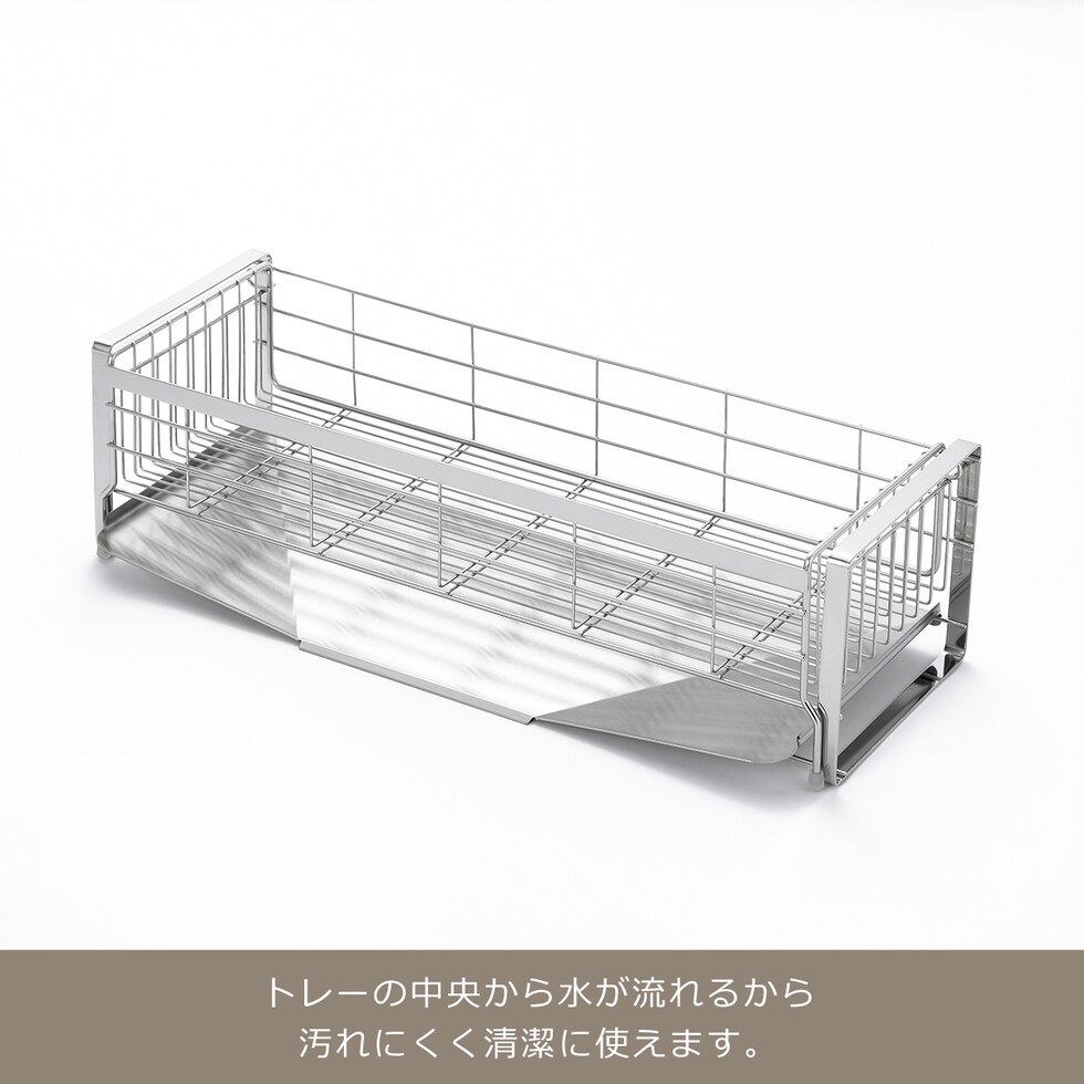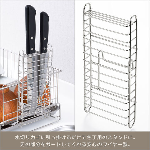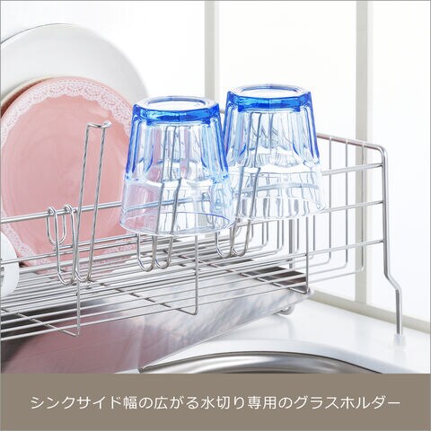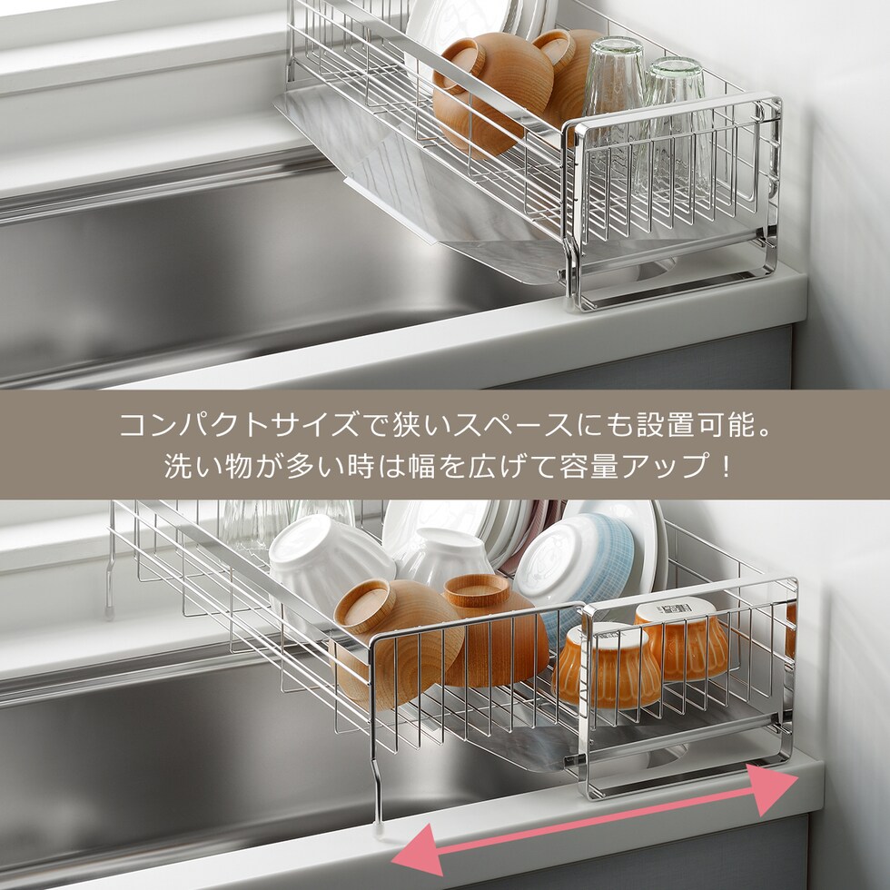 | シンプルでスタイリッシュな水切りカゴ。通常時はすっきりスリムに、洗い物が多い時には広げて容量アップ。狭いスペースにも設置が可能です。 水切りかごと一緒に使いたい、グラスや包丁の収納アイテムがセットに! |