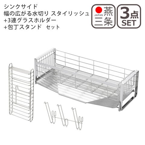 ヨシカワ シンクサイド幅の広がるスタイリッシュ 水切りかご 20x57 + 3連グラスホルダー + 包丁スタンド 3点セット 伸縮式水切りラック 燕三条産 日本製 yoshikawa 【北海道・沖縄は990円加算】 ysk9999-21