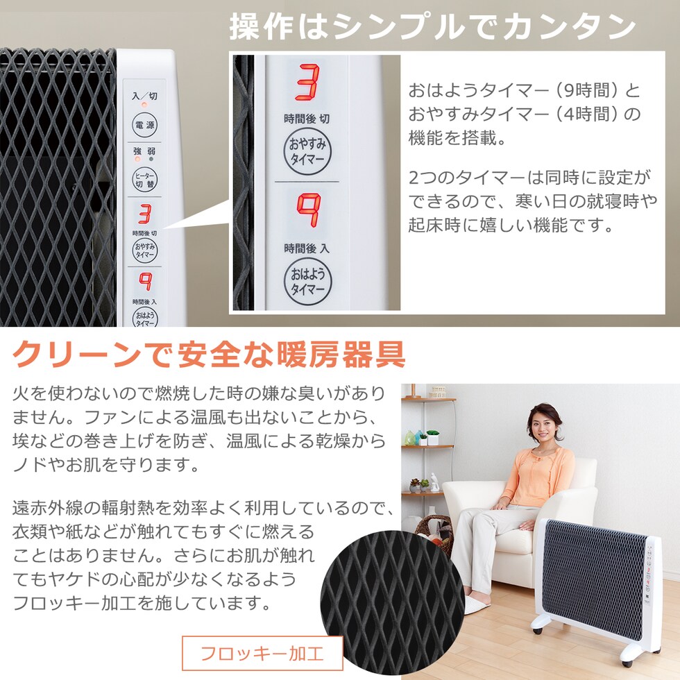 ・本体の厚さわずか【7cm】の薄型型デザイン ・操作パネル部分をスッキリとリニューアル ・遠赤外線の効果で身体を優しく暖めます ・火を使わないから燃焼ガスの嫌なニオイの心配がありません ・ファンによる温風送風もないので、ホコリやハウスダストをのまきあげません また、温風の影響による乾燥から喉や肌を守ります ・「W暖流方式」でお部屋全体を効果的に暖めます ・ヤケドの心配が少なくなるよう、前面パネルにフロッキー(植毛)加工をしています ・小さなお子様にも安心な暖房機です ・おはよう(ON)タイマー・おやすみ(OFF)タイマー付きです ・本体が45度以上傾いた時に電源が切れる「転倒時安全装置」を採用しています ・キャスター付きなので移動もスムーズです |