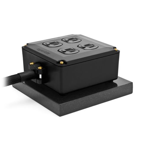 黒御影石の質量付加によって“OCB-1”の設置が飛躍的に安定。ケーブルの差し込みによる電源タップの浮き上がりを抑制。