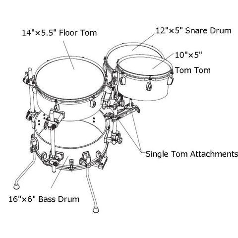 また、付属のドラムバッグ・ハードウェアバッグに全てのコンポーネントを収納できるので、『機材の運搬』も簡単。さらに、バスドラムとフロアタムを繋ぐパイプに、シンバルアタッチメントをセットすれば、シンバルやハイハットシンバルもマウント可能です。アイデア次第で通常のドラムセットに勝るとも劣らない、様々なセットアップを実現できます。