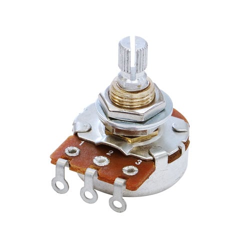 No-Loadポットはトーン専用ポットです。通常のトーンではフルテンの状態でも抵抗を介して少量の電気信号がアースへ流れてしまい、高音域が削られて音がこもってしまいます。No-Loadポットではフルテンのときに端子が抵抗体に触れない構造になっているため、従来のポットのように電気信号がアースへ流れず、より煌びやかでパワフルなサウンドが得られます。ツマミを回した際には通常のトーンと同じ効果を発揮します。