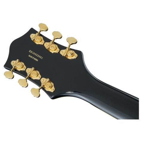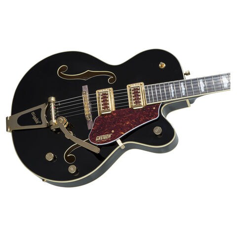 クラシックなブラック・フィニッシュ、50年代初頭の拡大したヘッドストック、パーロイドのハンプトップ・インレイ、PUインサート部にマッチしたピックガードの色に加え、ゴールドハードウェアを採用。固定されたAdjusto-Maticブリッジ、Graph Tech NuBoneナット、Gアロー・コントロールノブ、Bigsby B60テールピースなど、他に類を見ないクラシカルでトゥワンギーなサウンドを提供する、ホロウボディ用の仕様を搭載しています。