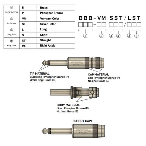 プラグの材質には真鍮(Brass)とリン青銅(Phosphor Bronze)を採用し、チップ、ボディ、キャップの各素材を真鍮/リン青銅の様々な組み合わせの中から選ぶ事ができます。