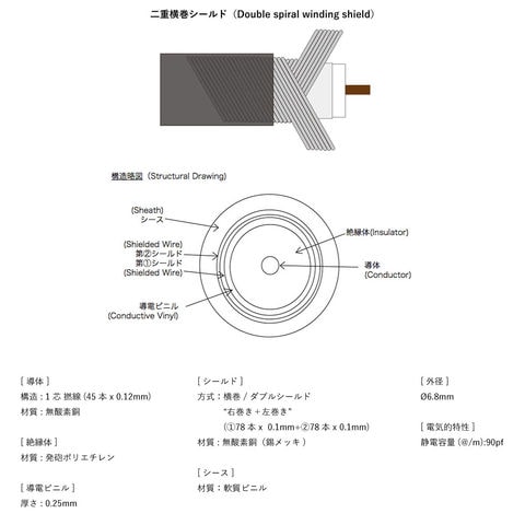 楽器用ケーブルに採用される数あるシールド方法の中でも代表的な4種類(編組、螺旋横巻、二重螺旋横巻、フィルム)から、動的な使用においてノイズ面やケーブルの柔軟性で有利に設計でき、またサウンド的にも最も癖がないと感じた二重螺旋横巻シールドを採用。