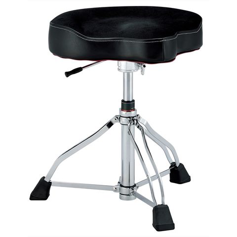 ドラムスローンにとって重要な“座り心地”を決める要素の一つは座面の硬さ。ドラマーはスローンに座った瞬間に感じるその感覚で、そのスローンが自分にフィットしているかどうか判断することができます。座面の硬さはシート形状や素材、表面の生地の伸縮性、縫製の方法などの多くの要素の組み合わせに左右されます。それらを細かく検討し、『体の重心を安定して支え、長時間座った時の疲労の蓄積を軽減する』ことを目標に生まれた1st Chair Glide Rider (グライド・ライダー)ドラムスローンは、シート内部に型成形による硬質の発泡ウレタン、座面の天面はプレイ中の滑りを防ぐ効果があるクロス素材を採用し、今までのTAMA のモデルにはなかった理想的な柔らかさと硬さのバランスを実現したサドル形状のドラムスローンです。