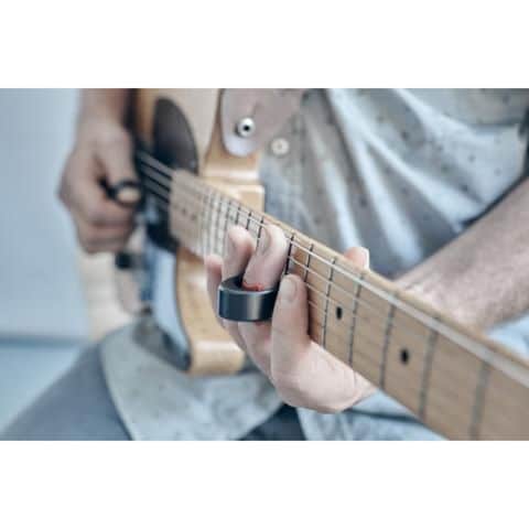 ブラックマウンテンのスライドリングは、中指または薬指の第1関節と第2関節の間に装着するようになっています。 バネ式のアームで挟み、金属製のリングを装着します。 これにより、4本の指で普通に演奏しながらも、いつでもスライド演奏ができるようになります。
