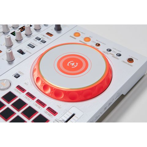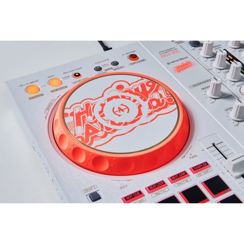 Happy Around!のユニットカラーとエネルギッシュさを表現するために、ボディ全体にはホワイトを基調としたデザインを採用し、ジョグには鮮やかなオレンジを施しました。ジョグ天面とミキサー部にはHappy Around!のオリジナルロゴを採用することで、唯一無二なデザインのDJコントローラーとなっています。