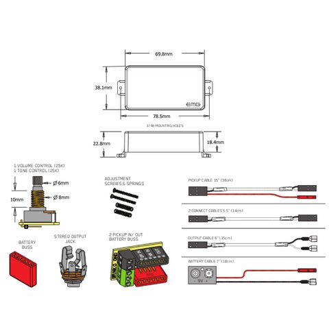 ピックアップ本体1個、専用ポット、電池ホルダー、アウトプットジャックなど一式全てパッケージングされたセットです。