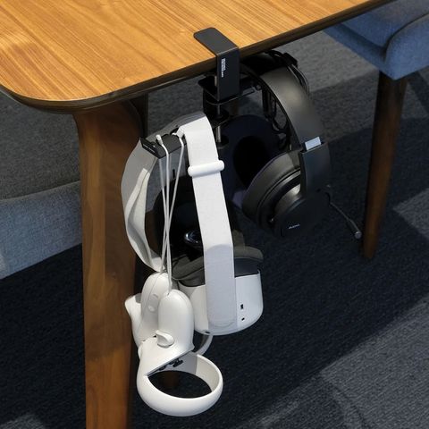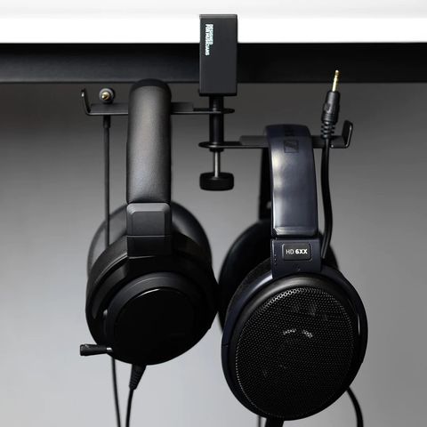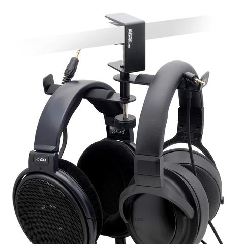 Dual Suspensionはデスクの下から留めて使用する2台のヘッドフォンを収納することができるヘッドフォンハンガーです。