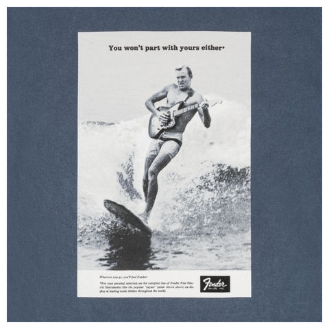 このアイコニックなキャンペーンのサーファーグラフィックをあしらったオーシャンブルーのTシャツを着て、フェンダーの歴史を味わいましょう。