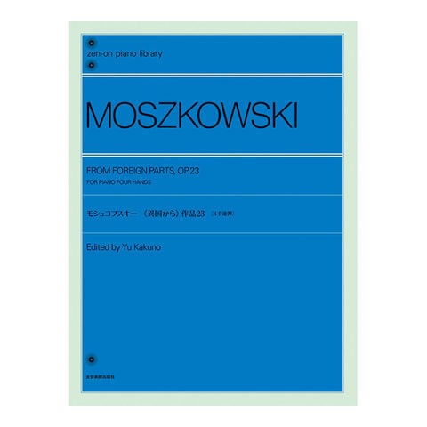 モシュコフスキーのもうひとつの魅力的な連弾曲!別名〈世界中の国々から〉。4手連弾の人気曲「スペイン舞曲集(作品12)」で知られるポーランドのピアニスト、作曲家のモーリッツ・モシュコフスキーのさらなる代表作《異国から》作品23が、ピアノ・デュオの研究と指導で活躍する角野 裕の校訂により出版。18世紀後半のポーランドとその周辺国の華やかな民俗性や、特徴的な国民性が豊かに表現される6曲で構成。楽譜は初出版譜から作曲者の最終校訂版、そして管弦楽編曲版まで仔細に研究してまとめられた決定版です。スコア形式の楽譜。作品をより理解するための詳しい解説つき。