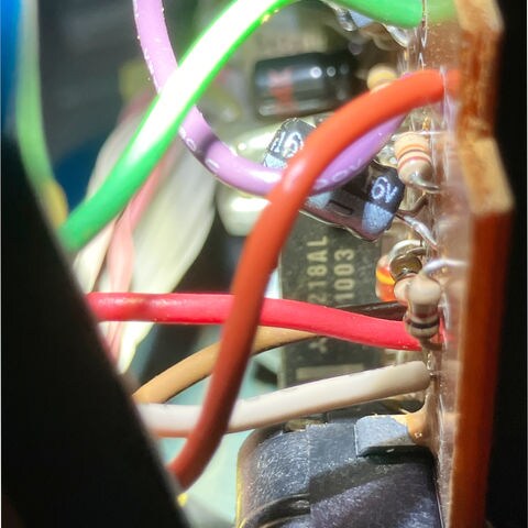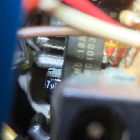三菱のOP-AMP( M5218AL)と青いタンタルコンデンサ×2を使用している初期型の個体です。