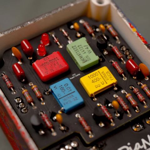 "Vitamin C Super Lucky 7" はパーツから特別なこだわりを持って作っています。特に一番注目するのは4色に彩られたボックスコンデンサでしょう。これら4色のコンデンサはWIMAやEROのヴィンテージコンデンサを採用しています。それぞれがカップリングコンデンサとして信号ラインの音色に作用することで Vitamin C Super Lucky 7 ならではの倍音豊かなでダークな音色を作り出しています。