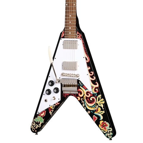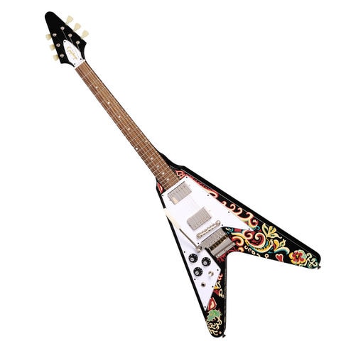 ジミ・ヘンドリックスは、ロック・ミュージックにおける最も革新的なギタリストとして広く認識されており、誰も到達したことのない領域までギターを進化させたプレイヤーです。この度、Epiphoneはギブソンカスタムおよびヘンドリックス家との連携により、1967年から1969年にかけてジミが多用したギター「Jimi Hendrix “Love Drops” Flying V」の復刻モデルをインスパイアード・バイ・ギブソンカスタム・シリーズよりリリースします。元々はサンバースト仕上げだったこのギターについて、エボニーへのリフィニッシュ後、ジミ・ヘンドリックス自身の手描きでサイケデリックなグラフィックが施されました。この度のリリースにより、そのデザインが忠実に再現されました。