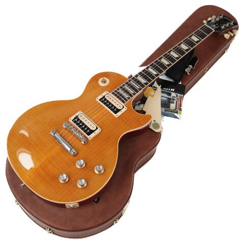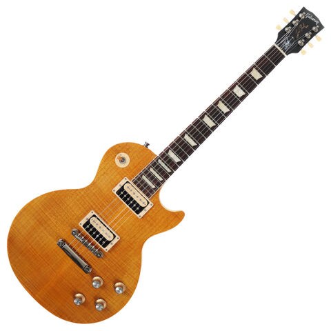AAAフィガード・メイプル・トップ、ソリッド・マホガニー・ボディ、そしてスラッシュお気に入りのフィーチャーであるCシェイプ・ネック・プロファイル、ギブソン・カスタム・バーストバッカー・アルニコII・ピックアップ、オレンジドロップ・キャパシターとハンドワイヤリング配線されたエレクトロニクスを搭載。