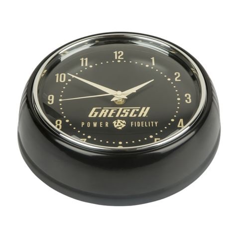 Gretsch Power & Fidelityのグラフィックをあしらい、アイボリーの針とインデックス数字が特徴の壁掛け時計。