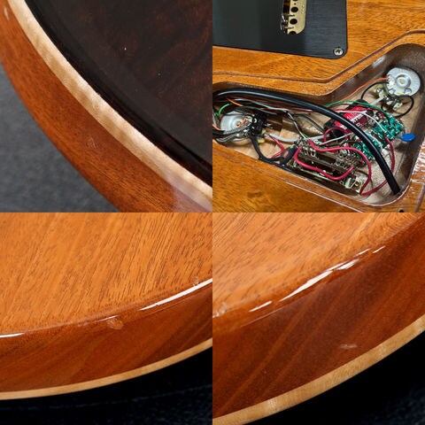 ボディーサイドとのかどに打痕、塗装かけ多数あり。ボディーエンドストップピン位置から6弦側へ行ったあたりに豆粒大のやや大きめの傷があります。