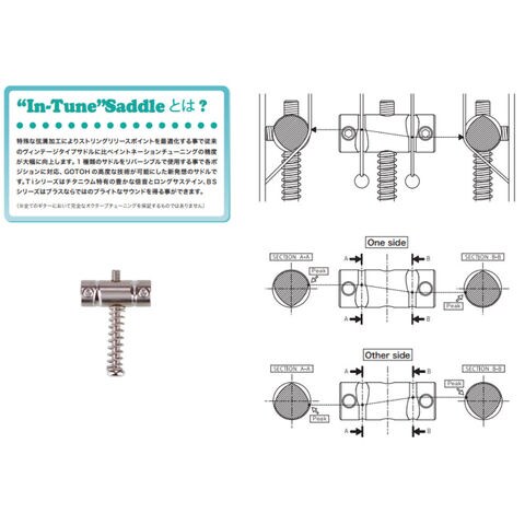 特殊な弦溝加工によりストリングリリースポイントを最適化する事で従来のヴィンテージタイプサドルに比べイントネーションチューニングの精度が大幅に向上します。1種類のサドルをリバーシブルで使用する事で各ポジションに対応、GOTOHの高度な技術が可能にした新発想のサドルです。Tiシリーズはチタニウム特有の豊かな倍音とロングサステイン、BSシリーズはブラスならではのブライトなサウンドを得る事ができます。