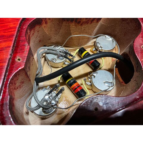 カラーはBellaDonna Burst。レモン系の黄色味の強い中央部からスイッチ周りにかけてフェードしていくカラーはまさにビンテージバーストでよく現れる色合いです。