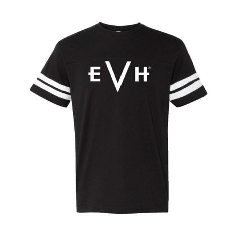 クルーネックの半袖デザインにホワイトのEVHロゴをあしらった、ブラックのユニセックス・フットボールスタイルジャージ。