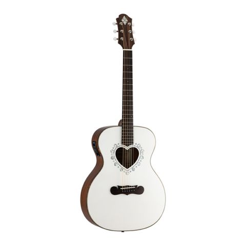 ハート型サウンドホールのオーケストラ・モデルのCAF-90Hは、マザー・オブ・パールのダイヤモンド・インレイが輝く特徴的なヘッドストックを持ったマホガニー・ネックにローズウッド・フィンガーボードを採用した20フレット仕様の14フレット・ジョイントとなっています。