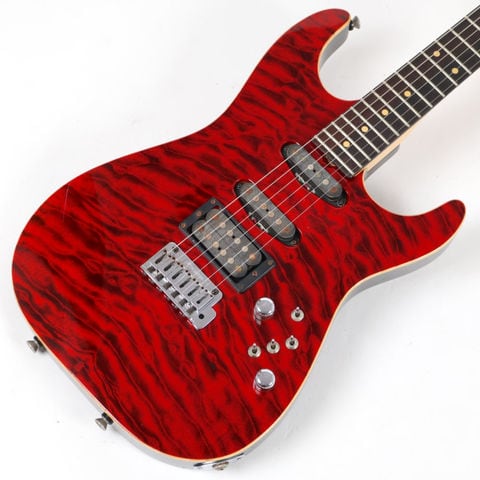 深く玉の大きな素晴らしい木目のキルテッドメイプルをトップに配しトムアンダーソンの定番カラーCajun Redで仕上げられた燃え上がるような表情が美しい1本です。