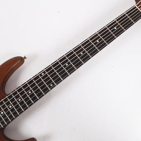 マホガニーをブビンガのトップとバックで挟んだボディに積層材のスルーネック仕様。材の色的にパープルハートとメイプルの積層材のように見えますが、詳細は不明です。指板材はエボニーを採用しています。