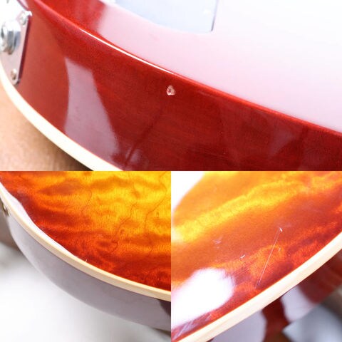 トップには見事な木目のAAAグレードのキルテッドメイプルを採用。カラーはややダークな赤みのティーバーストだと思われます。