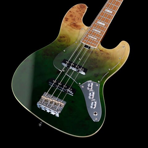 バールポプラトップを採用したJBスタイル「SJB-800」は、美しい木目を引き立てるカラーリングに加え、ローステッド・メイプルネックやネックバインディング、ブロックポジションマークによる高級感あふれるルックスが特長です。ピックアップやブリッジには信頼のWilkinson製パーツを搭載し、外観だけでなくサウンドや演奏性にもこだわりました。さらに、ネックジョイント部にはヒールレスカットを施すことで、ハイポジションでのプレイアビリティも大幅に向上しています。