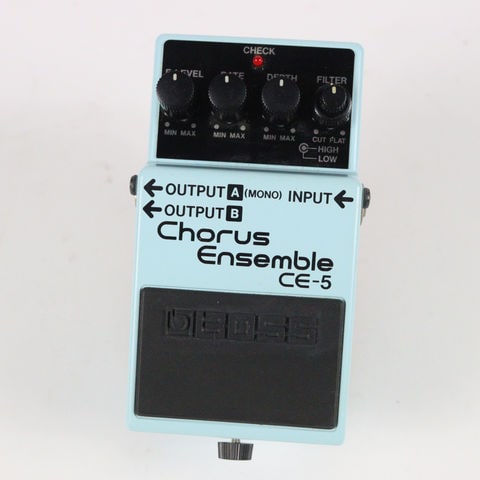 CE-5は、世界初のコーラス・エフェクトBOSS Chorus Ensemble CE-1からその名を受け継いだ、幅広いサウンドメイクが可能なコーラスです。可変域の広い各コントローラーと、2つのFILTERを駆使することで、美しく澄んだ響きからピッチが激しく揺れ動く個性的なキャラクターまで、多彩なサウンドを表現できます。また、2つのアウトプット端子から2台のアンプに接続することで、奥行きのあるステレオ・コーラス効果を得ることができます。CE-5は、イメージ通りのコーラス・サウンドを実現する対応力の高いコーラス・ペダルです。