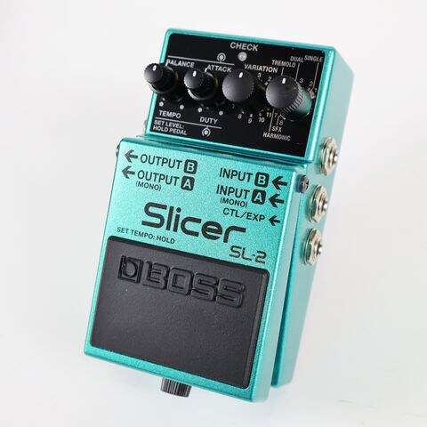 スライサーとは、ビートに合わせてサウンドを分割することでリズミカルなサウンドを生み出すエフェクターです。2008年に登場したBOSS SL-20 Slicerは、2つのフットペダルと直感的なインターフェイスを備えたツインペダル・シリーズより発売されました。個性豊かなスライス・パターンとステレオ出力時のダイナミックに飛び交う音の動きは、BOSSらしいユニークなエフェクターとして、様々なプレイヤーから愛されてきました。
