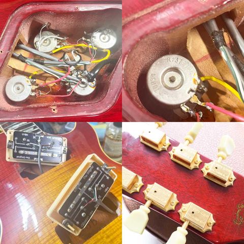 Gibson Custom Shopの組織としての正式な設立は1992年頃ですが、本機はその前に作られた’59 Re-issue(いわゆるプレヒストリック)でゴールドハードウェア、ピックガードレス仕様など通常の仕様とはやや違ったスペックですので、’59 Re-issueベースの限定モデル、またはオーダーモデルとして作られたことでCustom Shopデカールが入れられたのではないと推測します。