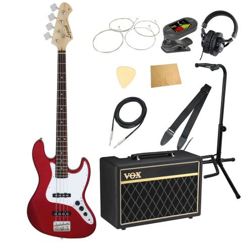 エレキベースにVOXアンプ「VOX Pathfinder Bass 10」、ケーブル、チューナー、ストラップ、換え弦、スタンド、ピック、クロス、ヘッドホンをお付けした10点セットです。