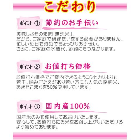 | ★良食味のあきたこまちを5割使用した100%国内産米! ★“価格”と“食味”のバランスに努めた無洗米! |