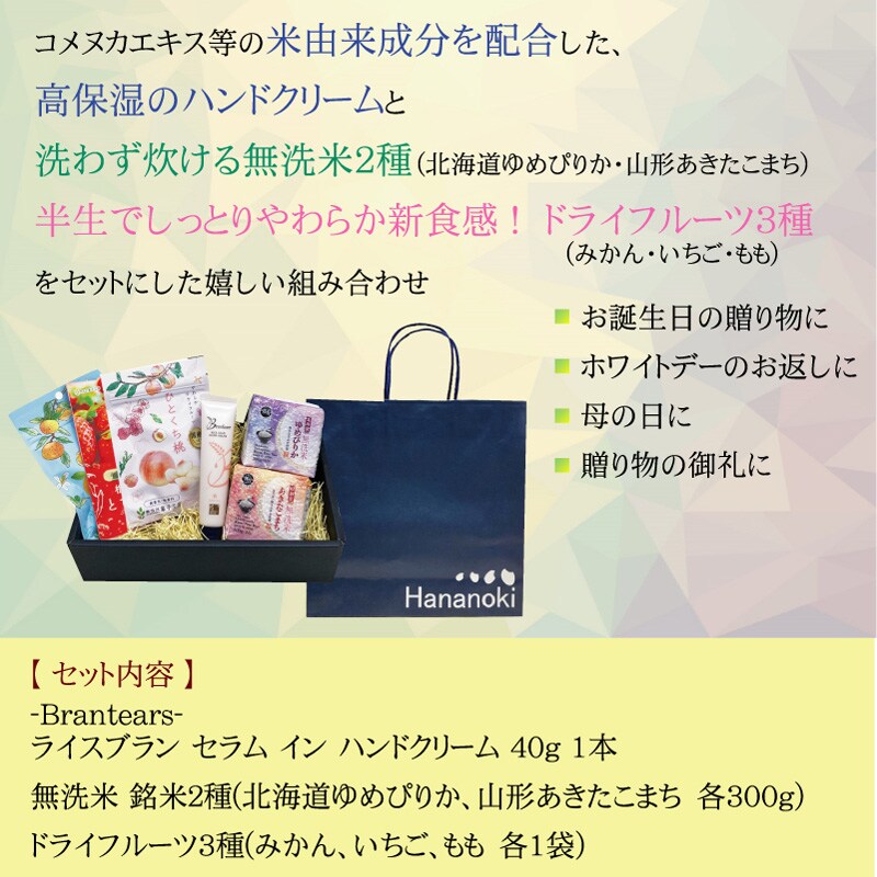 紙袋付き ギフト ブランティアーズ ハンドクリーム 40g×1本 + 銘米食べ比べ2種 令和5年産 (北海道ゆめぴりか&山形あきたこまち) + ドライフルーツ3種(みかん&苺&桃またはキウイ) gift_s