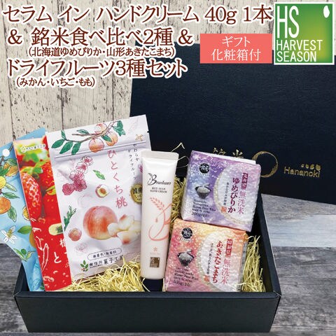 贅沢なハンドクリームと銘米無洗米食べ比べ 2種令和5年産 (北海道ゆめぴりか&山形あきたこまち) 、ドライフルーツ 3種(みかん&いちご&桃またはキウイ)のギフトセット