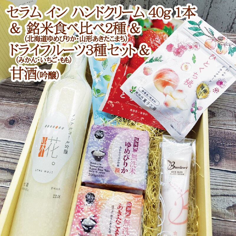 贅沢なハンドクリームと銘米無洗米食べ比べ 2種令和5年産 (北海道ゆめぴりか&山形あきたこまち) 、ドライフルーツ 3種(みかん&いちご&桃またはキウイ)&甘酒のギフトセット