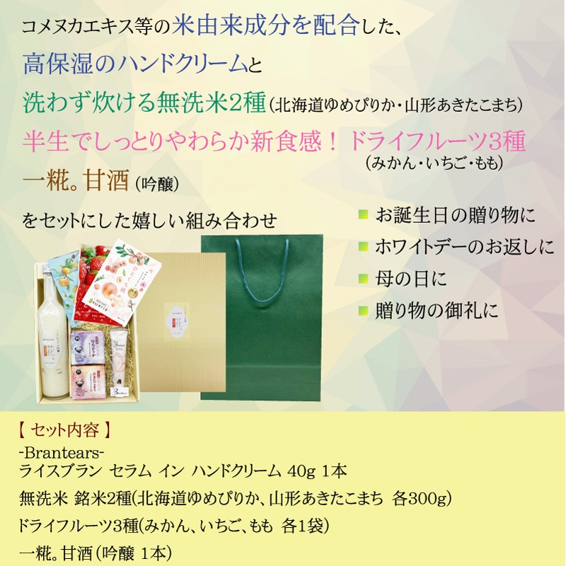 紙袋付き ギフト ブランティアーズ ハンドクリーム40g×1本+銘米2種 令和5年産 (北海道ゆめぴりか&山形あきたこまち)+甘酒×1本+ドライフルーツ3種(みかん&苺&桃またはキウイ) gift_s