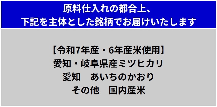 原料仕入れの都合上、米袋へ産年・産地・銘柄の表示は行っておりませんが、下記を主体とした銘柄でお届けいたします。