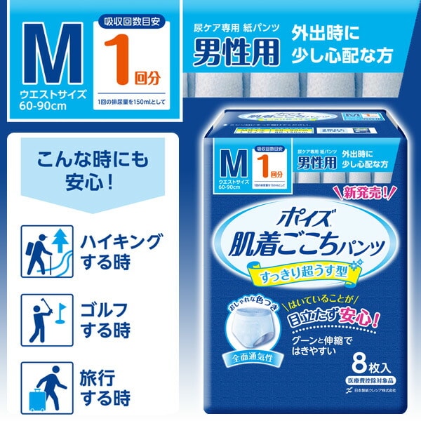 ポイズ 肌着ごこちパンツ 男性用 1回分 Mサイズ 8枚×8 (64枚) 80967 軽失禁 ショーツ パンツ 尿漏れ 尿モレ 尿もれ 薄型 うす型 使い捨て 紙パンツ 大人用紙おむつ 尿とり 日本製紙クレシア 【送料無料】