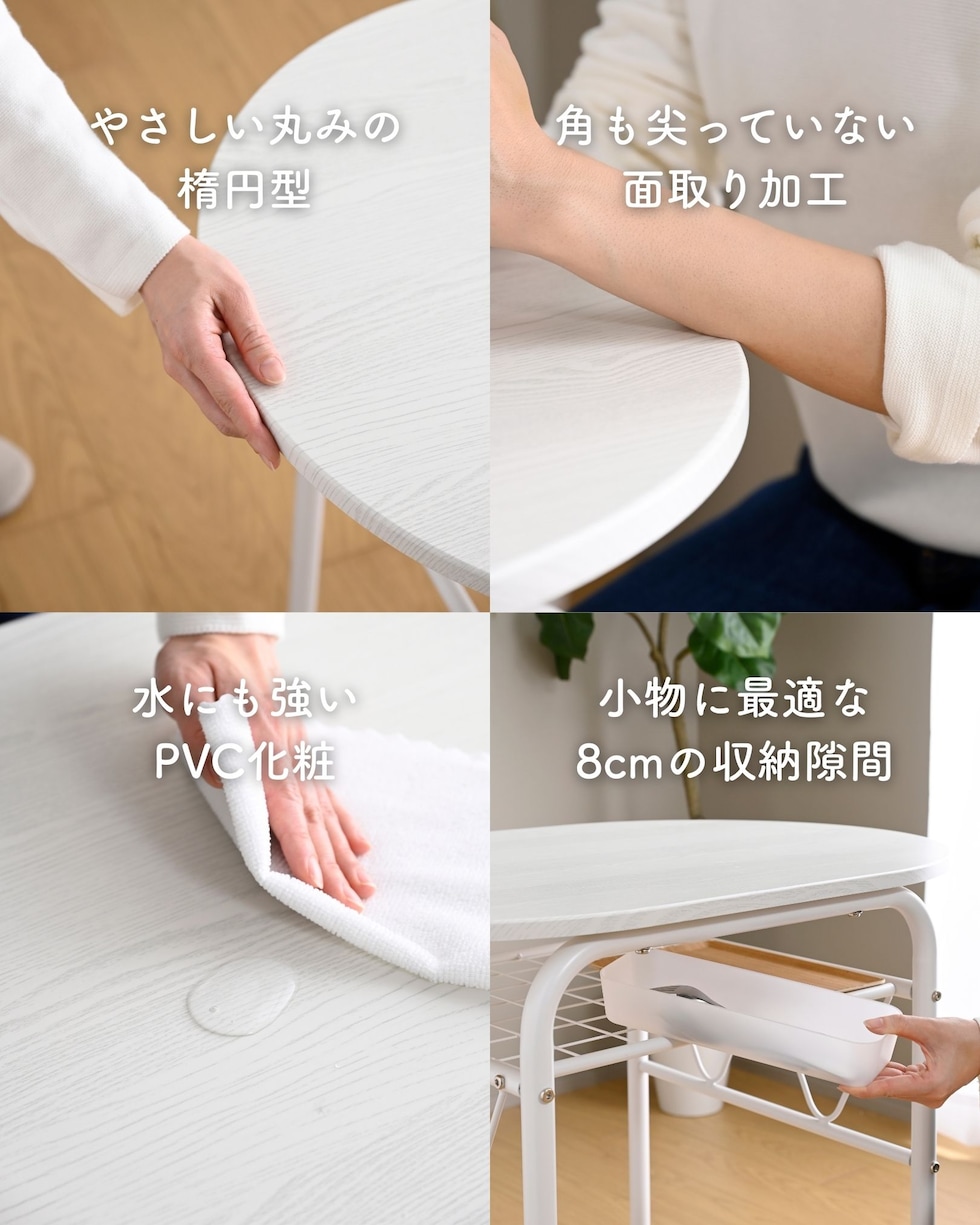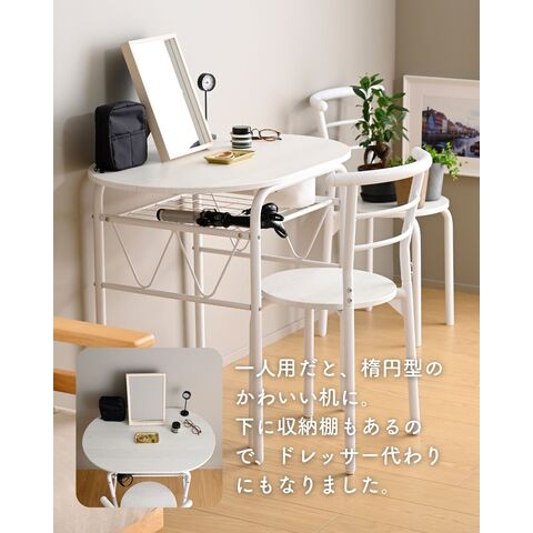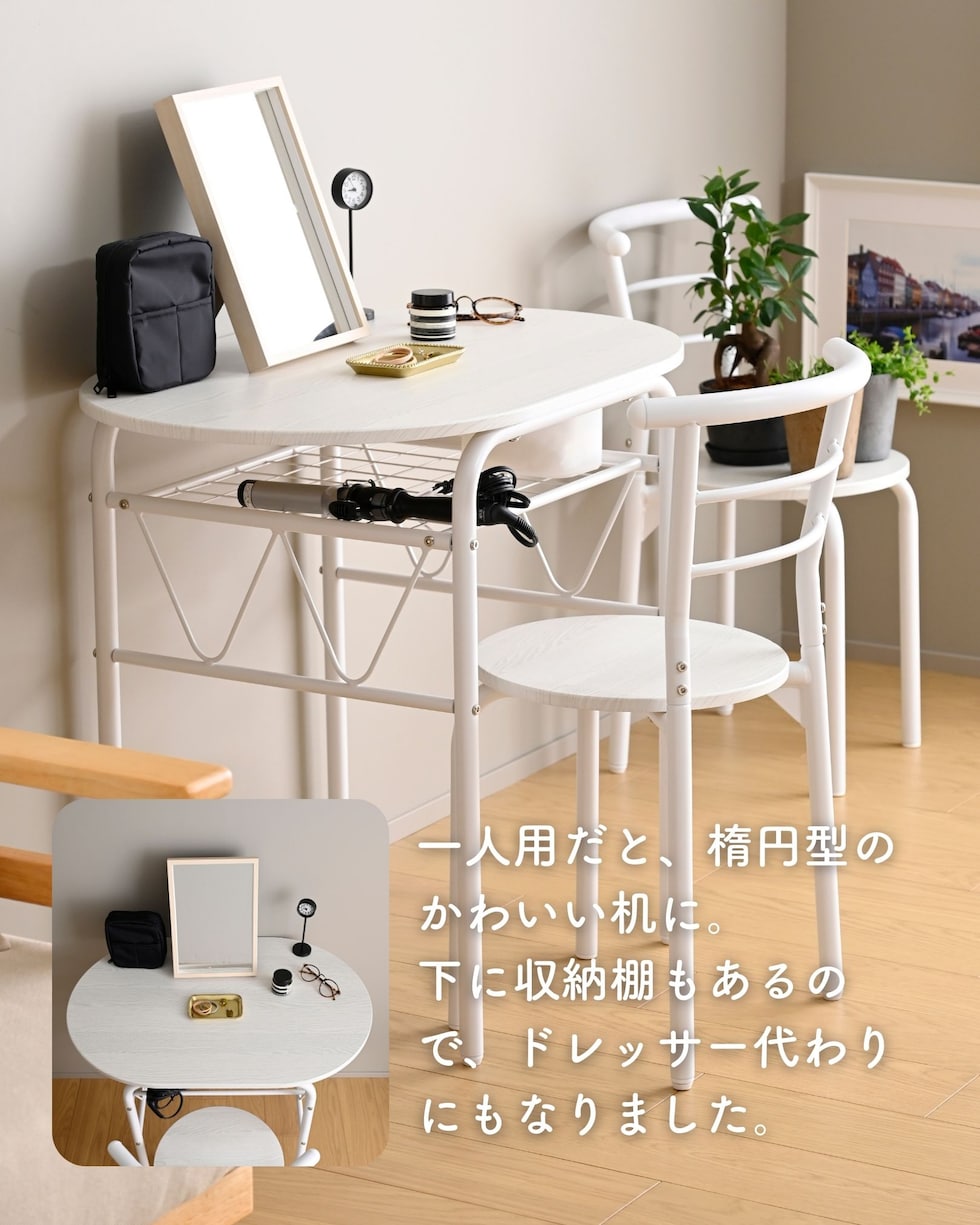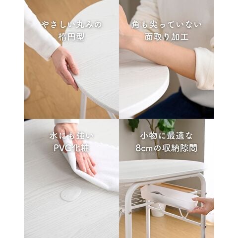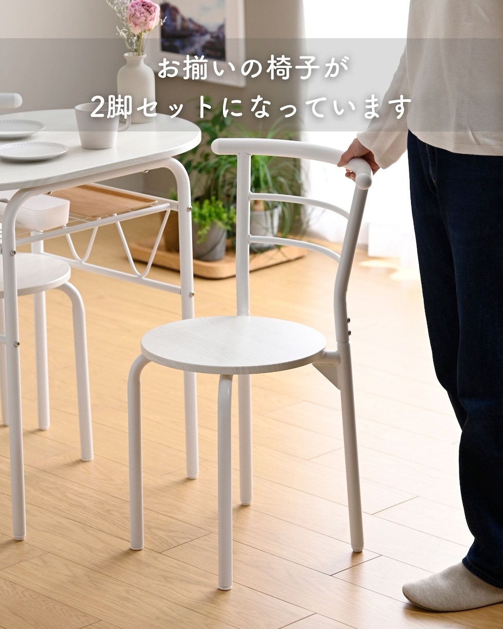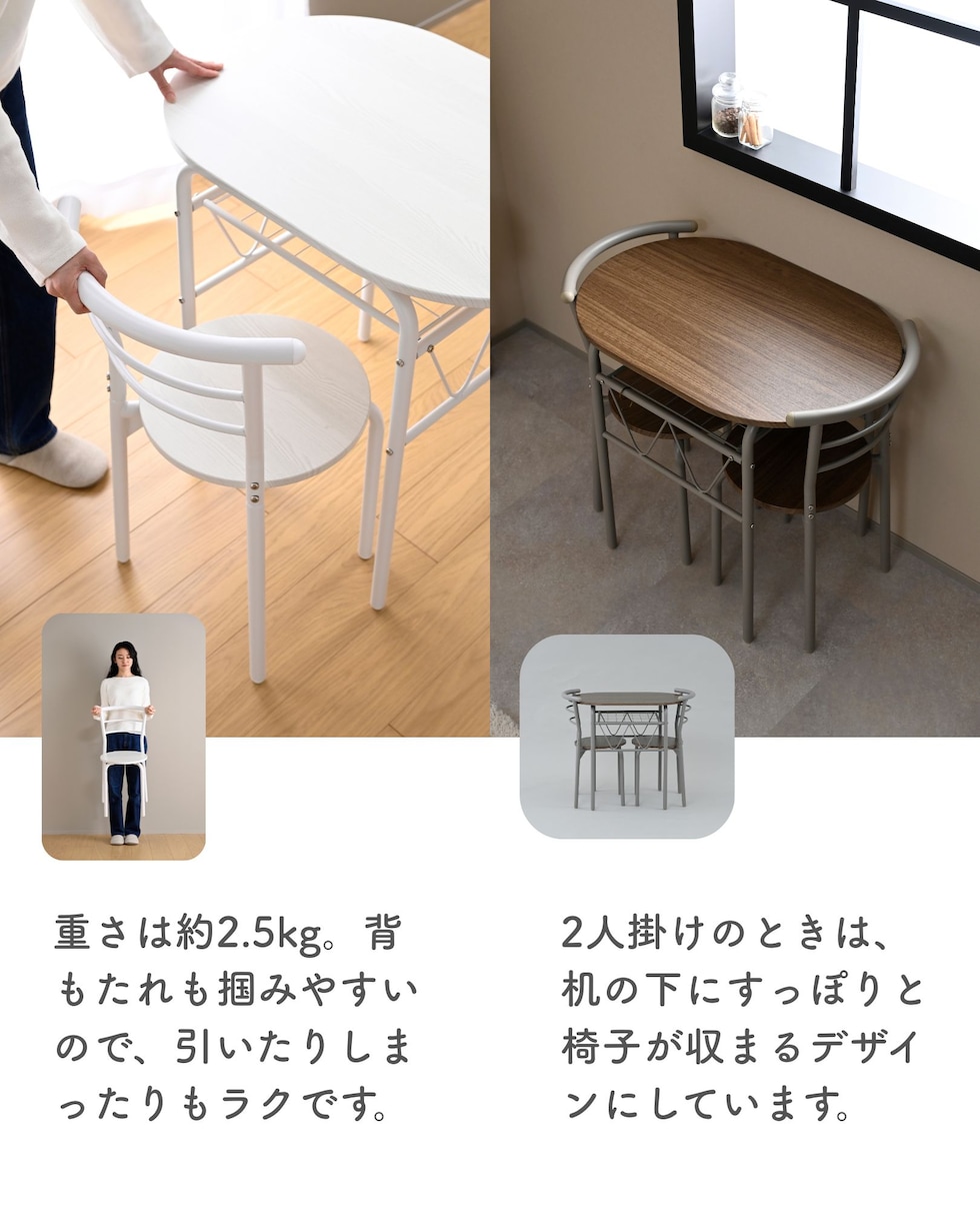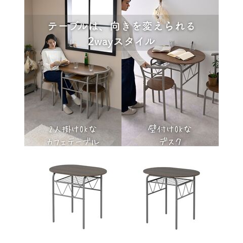 | 商品説明 | ●工具不要(六角レンチ付属) ●一人暮らし、二人暮らし部屋にうれしい、コンパクトなテーブル&チェア3点セット ※2026年3月16日より、旧材をリバイバル販売します。 【変更点】1. 本体サイズ、2. 天板形状が長方形→楕円形、3. テーブル脚が2way式に ▼テーブル ●かわいい楕円形のテーブル ●脚の向きを2通り選択でき、組み替えも可能(六角レンチ付属) ●タテ向きで2人掛けのダイニングに、ヨコ向きで壁付けできるデスクに変身 ●天板の下には網棚が付いて、カトラリーや小物の収納に最適 ●角が丸くやさしい面取り設計 ●付属のチェア2脚をすっぽり収納可能 ●天板は水に強い、木目調の樹脂製シート張り ●天板下スペース: 幅43 高さ69 棚下高さ59cm ●脚部には4か所ともアジャスター付きで、ガタツキを緩和 ●耐荷重: 天板50kg、棚5kg ▼チェア ●背もたれ付きのシンプルなチェア、2脚セット ●スチール製ながら体にフィットしやすいようカーブ形状にした背もたれ ●収納する際も天板に沿って省スペースに格納 ●座面は固いですが、木目調の樹脂製シート張りで水に強く、余ったときはサイドテーブルのように活躍 ●後脚2本にはアジャスター付きでガタツキを緩和 ●荷重の目安: 静止約80kg ●座面高さ: 42cm ●座部直径: 35cm ●背もたれ長さ: 32cm |