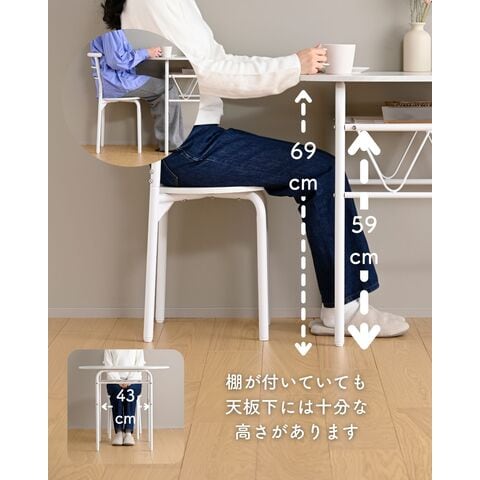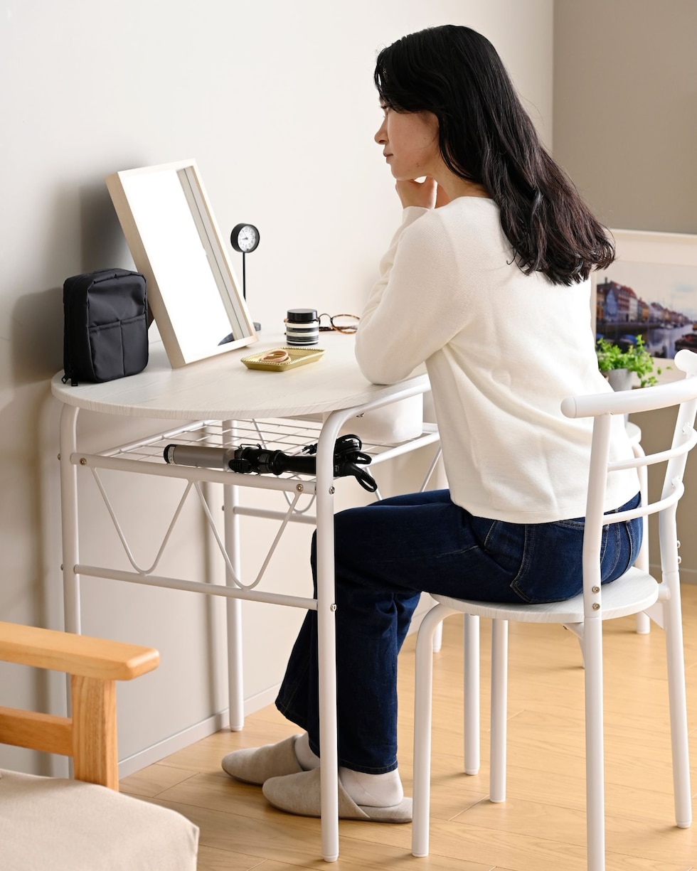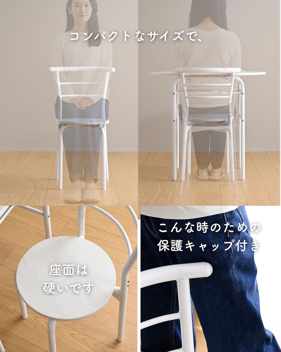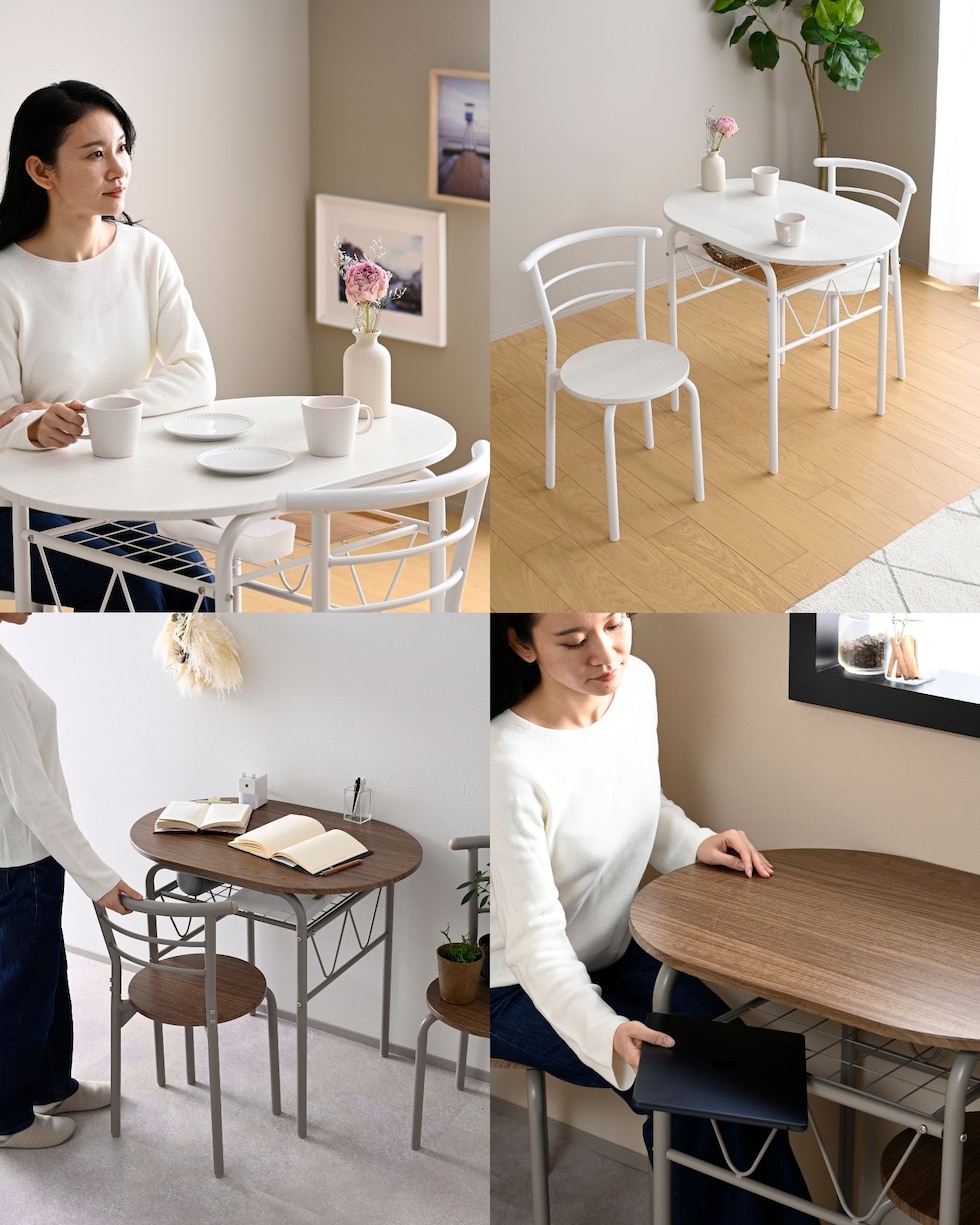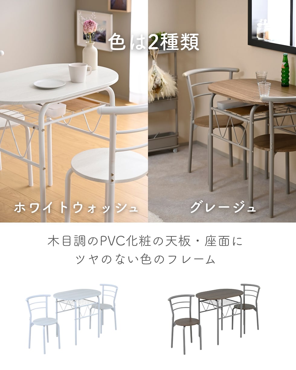 | 商品説明 | ●工具不要(六角レンチ付属) ●一人暮らし、二人暮らし部屋にうれしい、コンパクトなテーブル&チェア3点セット ※2026年3月16日より、旧材をリバイバル販売します。 【変更点】1. 本体サイズ、2. 天板形状が長方形→楕円形、3. テーブル脚が2way式に ▼テーブル ●かわいい楕円形のテーブル ●脚の向きを2通り選択でき、組み替えも可能(六角レンチ付属) ●タテ向きで2人掛けのダイニングに、ヨコ向きで壁付けできるデスクに変身 ●天板の下には網棚が付いて、カトラリーや小物の収納に最適 ●角が丸くやさしい面取り設計 ●付属のチェア2脚をすっぽり収納可能 ●天板は水に強い、木目調の樹脂製シート張り ●天板下スペース: 幅43 高さ69 棚下高さ59cm ●脚部には4か所ともアジャスター付きで、ガタツキを緩和 ●耐荷重: 天板50kg、棚5kg ▼チェア ●背もたれ付きのシンプルなチェア、2脚セット ●スチール製ながら体にフィットしやすいようカーブ形状にした背もたれ ●収納する際も天板に沿って省スペースに格納 ●座面は固いですが、木目調の樹脂製シート張りで水に強く、余ったときはサイドテーブルのように活躍 ●後脚2本にはアジャスター付きでガタツキを緩和 ●荷重の目安: 静止約80kg ●座面高さ: 42cm ●座部直径: 35cm ●背もたれ長さ: 32cm |